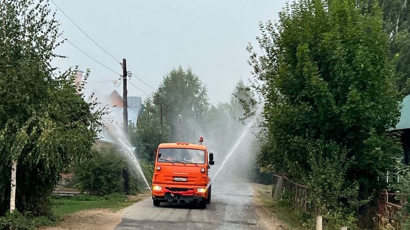 В деревне Деулино Рязанского района в субботу работали поливальные машины. Это мера профилактики — недалеко от поселка продолжает гореть лес.