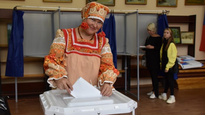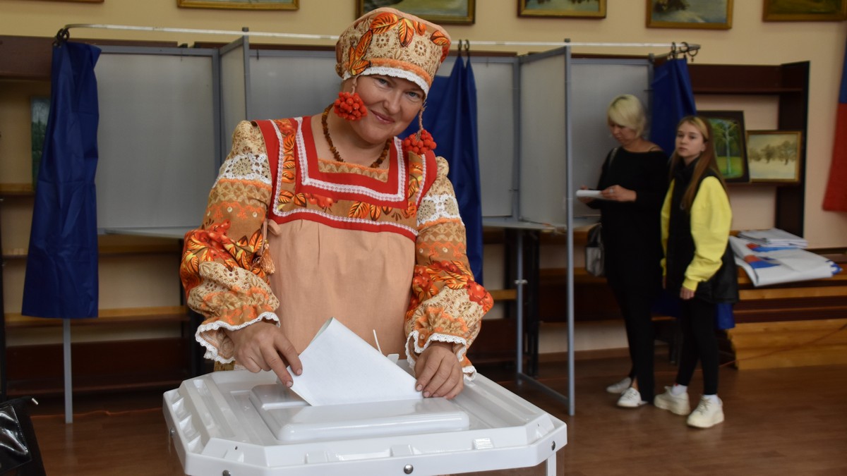 Необычная избирательница пришла на избирательный участок в Подвязьевском Доме культуры в воскресенье, 11 сентября. Наталья Секач, руководитель образцового театра моды «Кокетка», перед голосованием нарядилась в удивительный костюм Сударыни Осени.