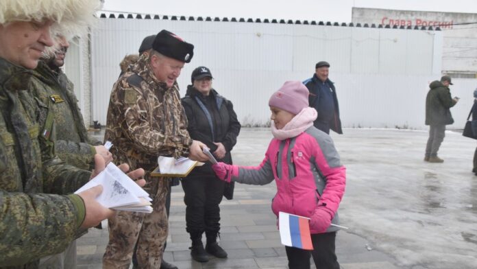 Перед отправлением колонны прошел митинг. Школьники вручили отбывающим больше 60 писем для бойцов и получили обещания непременно доставить их адресатам.