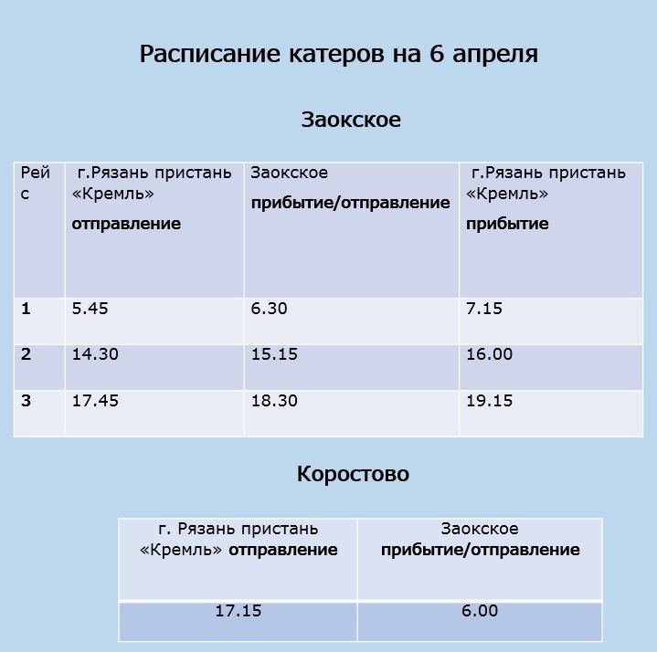 Как сообщил начальник отдела по делам ГО и ЧС администрации Рязанского района Андрей Недельский, с 5 апреля для перевозки жителей сел Заокское и Коростово, отрезанных поднявшейся водой, задействуют катера.