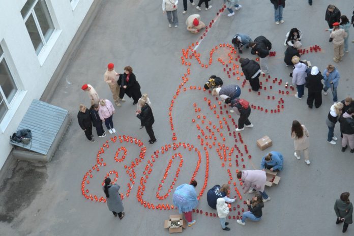 Во дворе учебного заведения собрались ученики и педагоги – представители практически всех школ Рязанского района. На асфальте из 400 свечей была выложена стилизованная фигура Родины-Матери – монумента в Волгограде, ставшего символом юбилея Победы нашего народа в Великой Отечественной войне, и цифра «80».