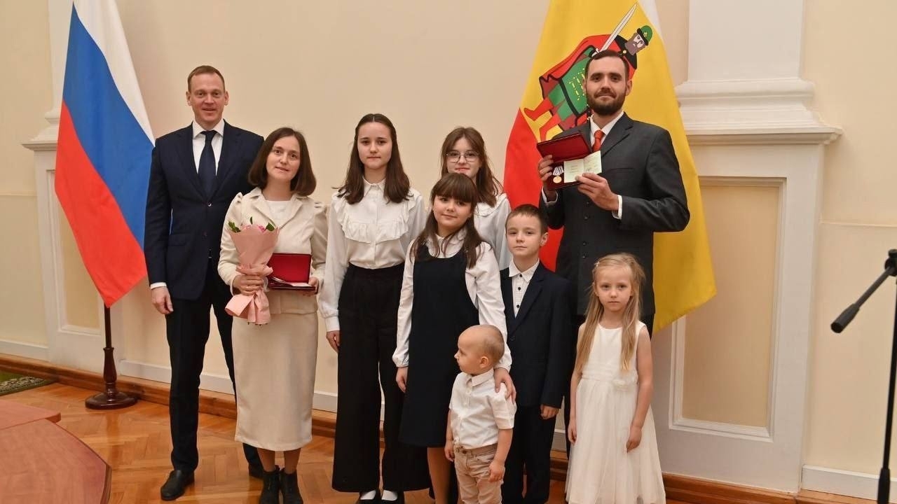 Губернатор Павел Малков вручил Светлане и Максиму Урусовым, жителям поселка Мурмино, медаль ордена «Родительская слава».