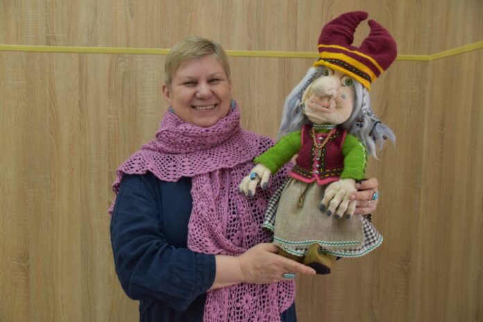 Лариса Химченко из Дядьковского Дома культуры привезла с собой большую куклу – Бабу-ягу. Благодаря ей она и заняла призовое место. Эта интерьерная игрушка связaна крючком со всеми анатомическими подробностями – суставами на руках; мышцами;, бородавками и даже, простите, ягодицами. Каждая деталь одежды – безрукавка ли, юбка, фартук, чулки, нижняя рубашка, ботинки на шнурках, рогатая головная кика – связaна или сшитa отдельно и потом надетa на куклу.